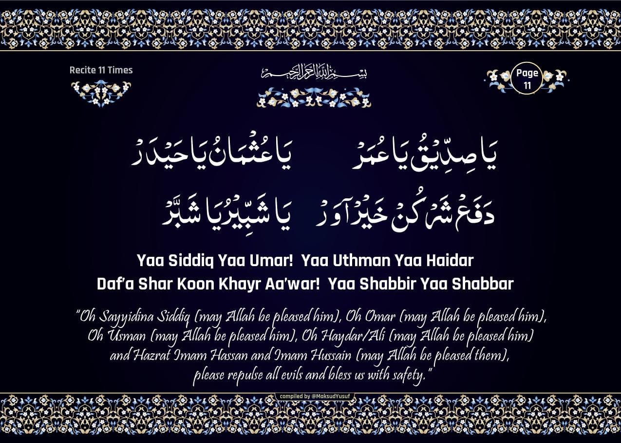 “Oh Sayyidina Siddiq (may Allah be pleased him), Oh Omar (may Allah be pleased him), Oh Usman (may Allah be pleased him), Oh Haydar/Ali (may Allah be pleased him) and Hazrat Imam Hassan and Imam Hussain (may Allah be pleased them), please repulse all evils and bless us with safety.”