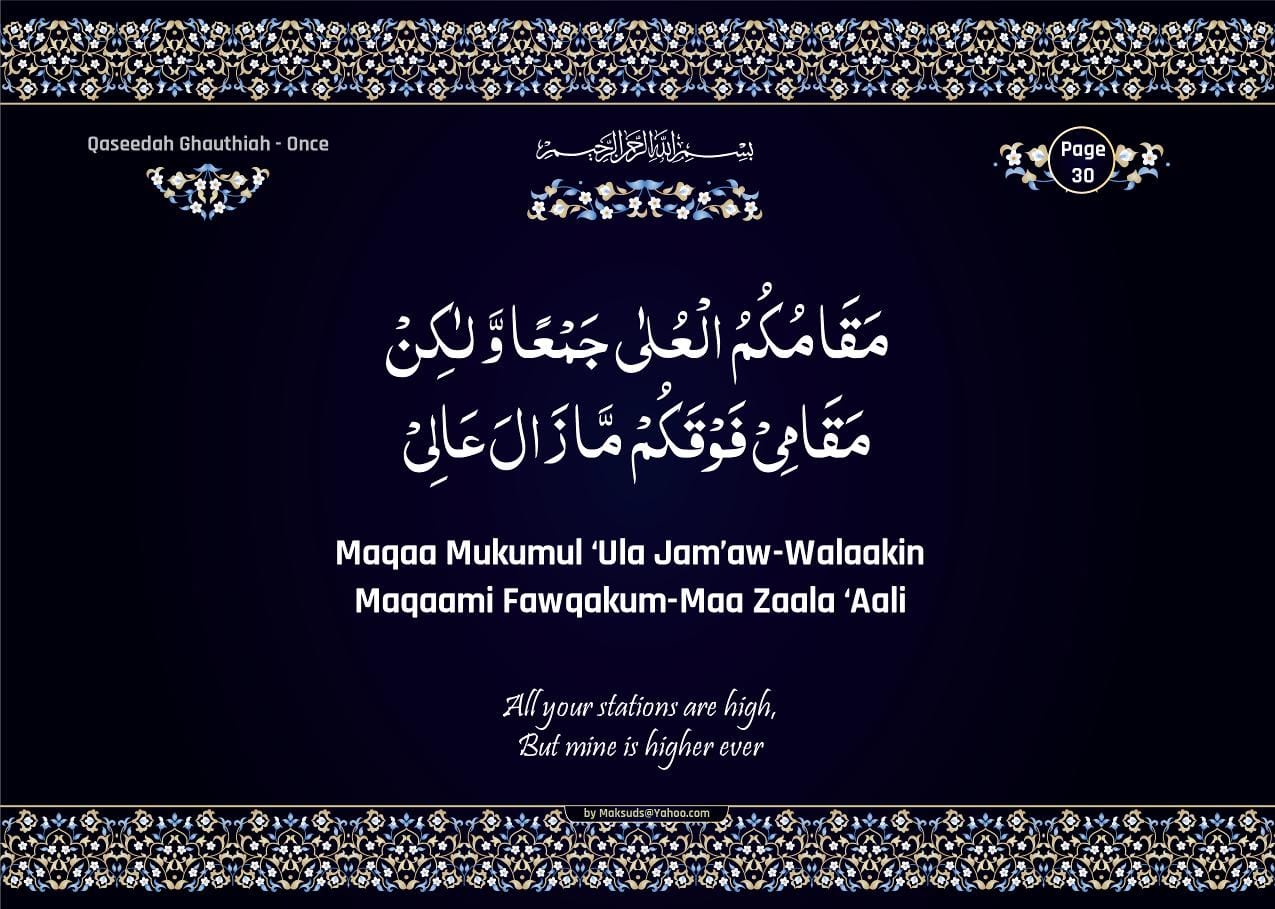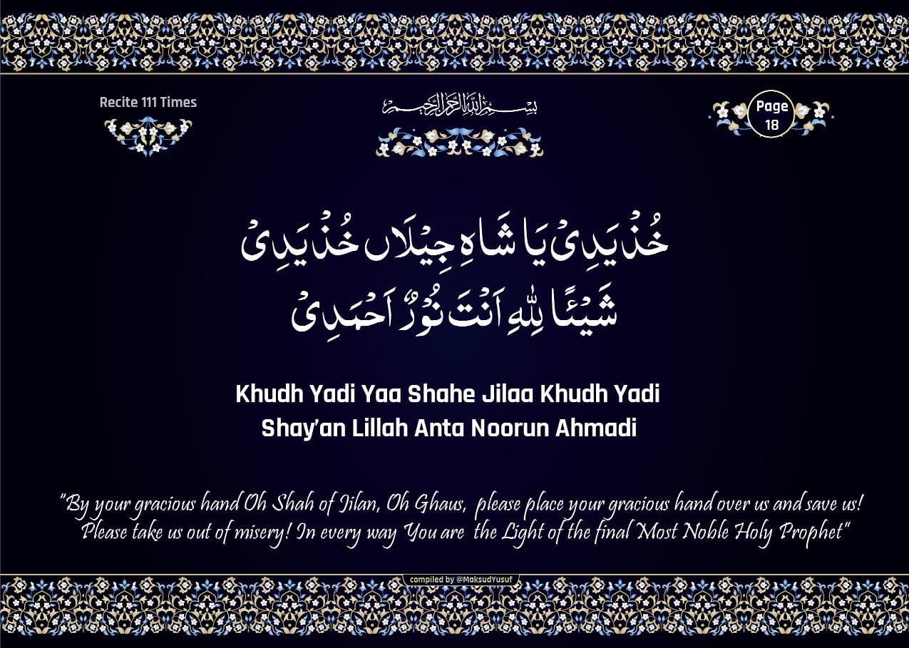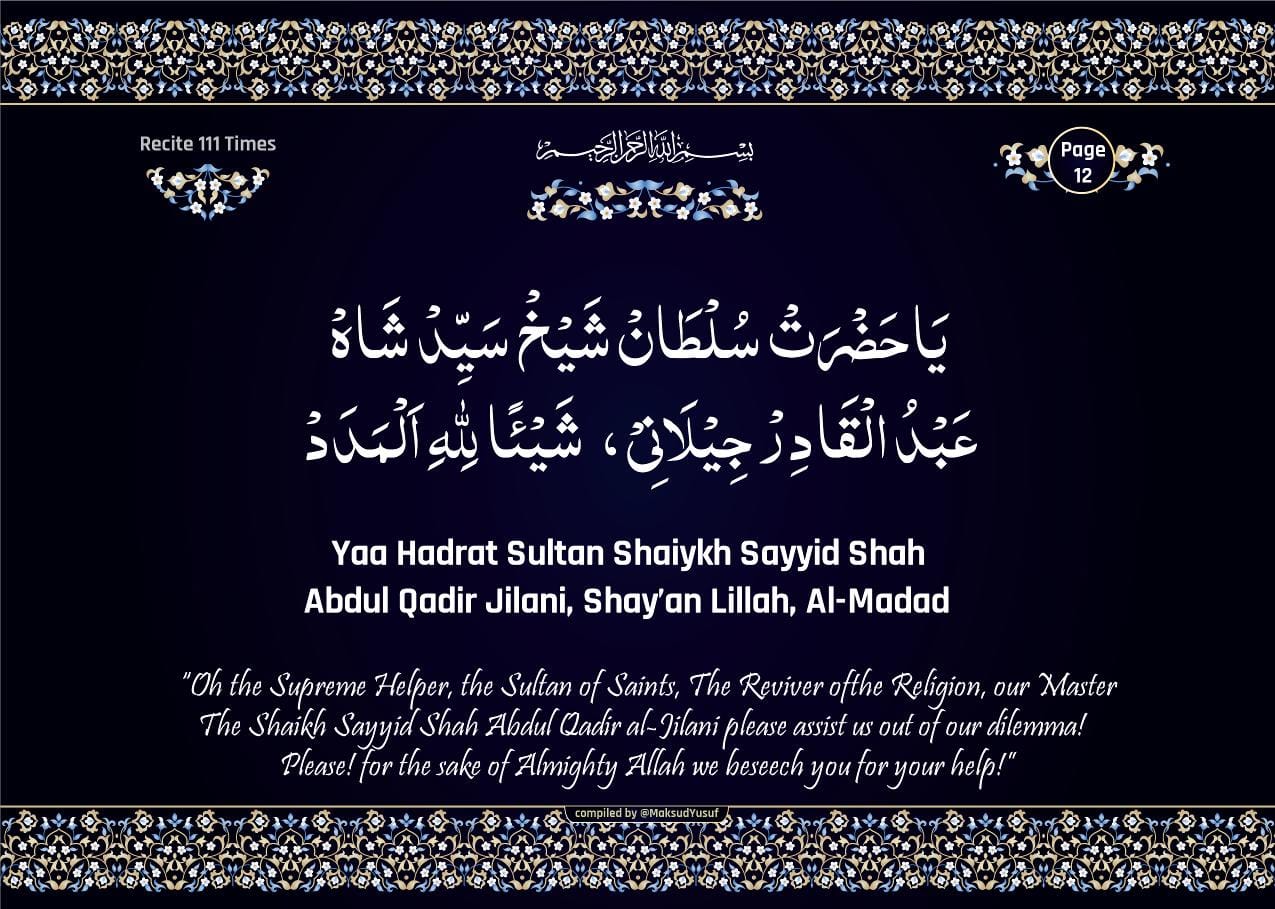 “Oh the Supreme Helper, the Sultan of Saints, The Reviver ofthe Religion, our Master The Shaikh Sayyid Shah Abdul Qadir al-Jilani please assist us out of our dilemma! Please! for the sake of Almighty Allah we beseech you for your help!”