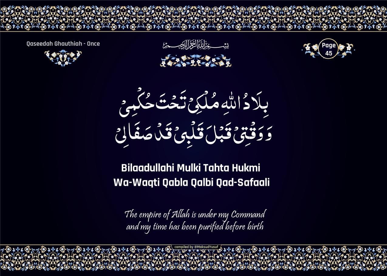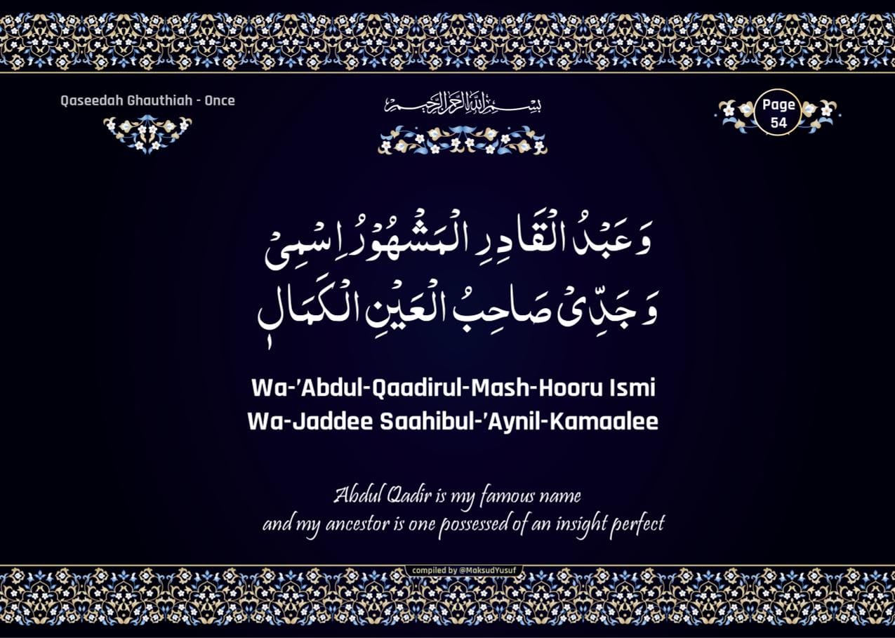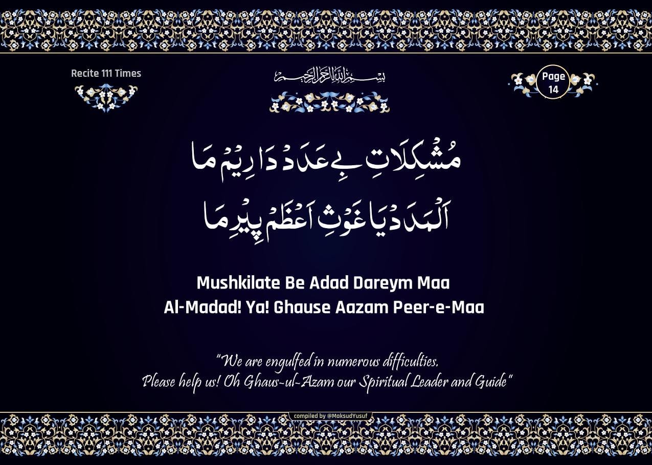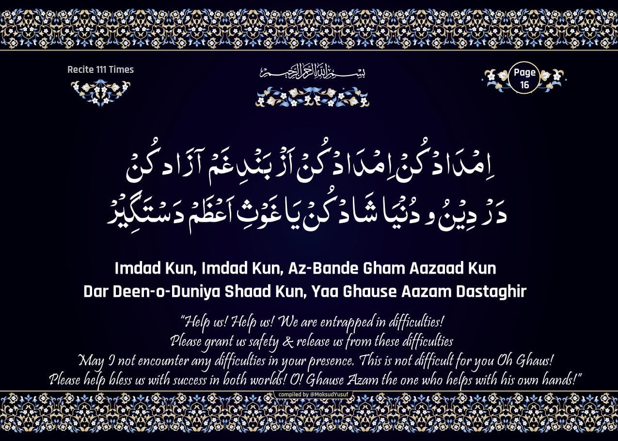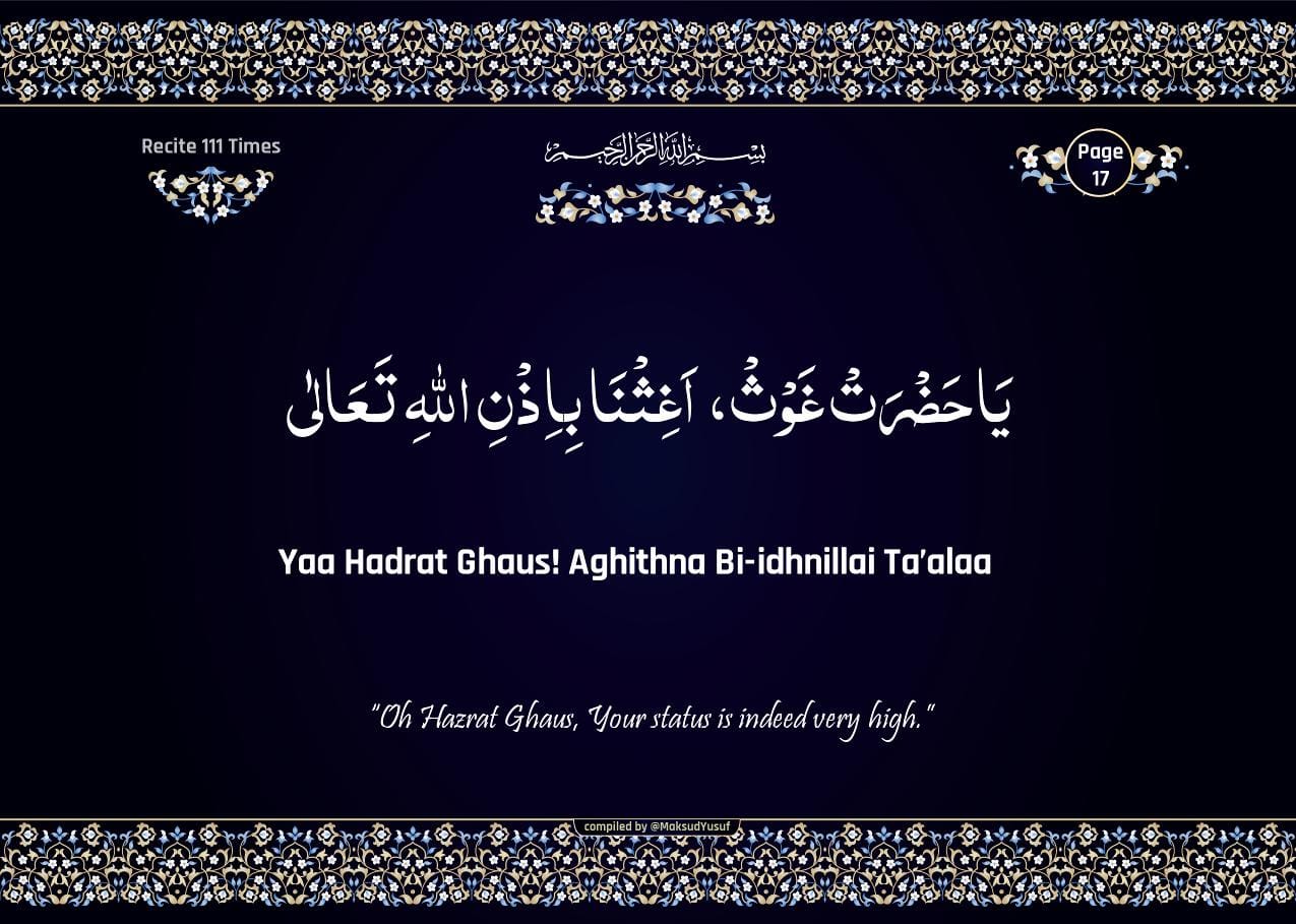 May I not encounter any difficulties in your presence. This is not difficult for you Oh Ghaus! Please help bless us with success in both worlds! O! Ghause Azam the one who helps with his own hands!”