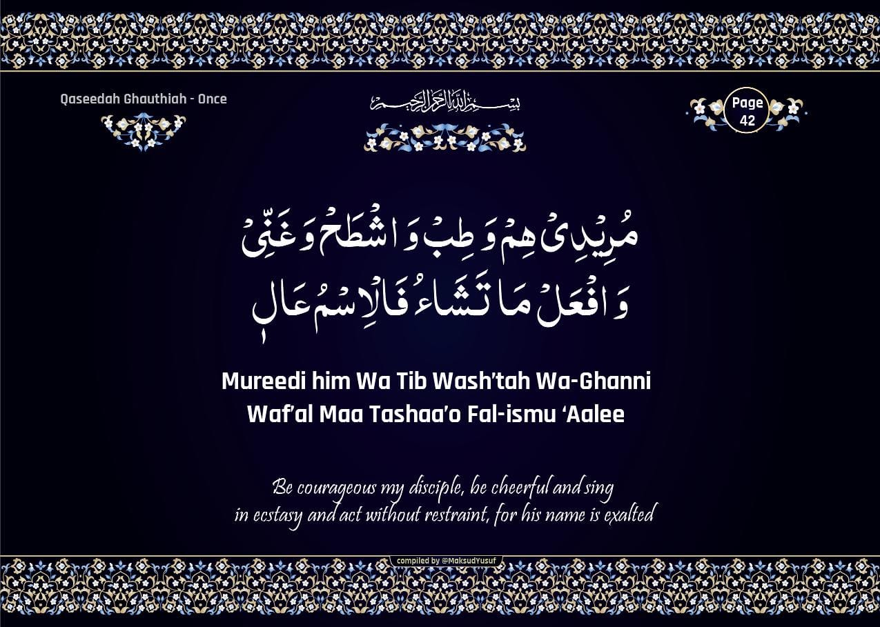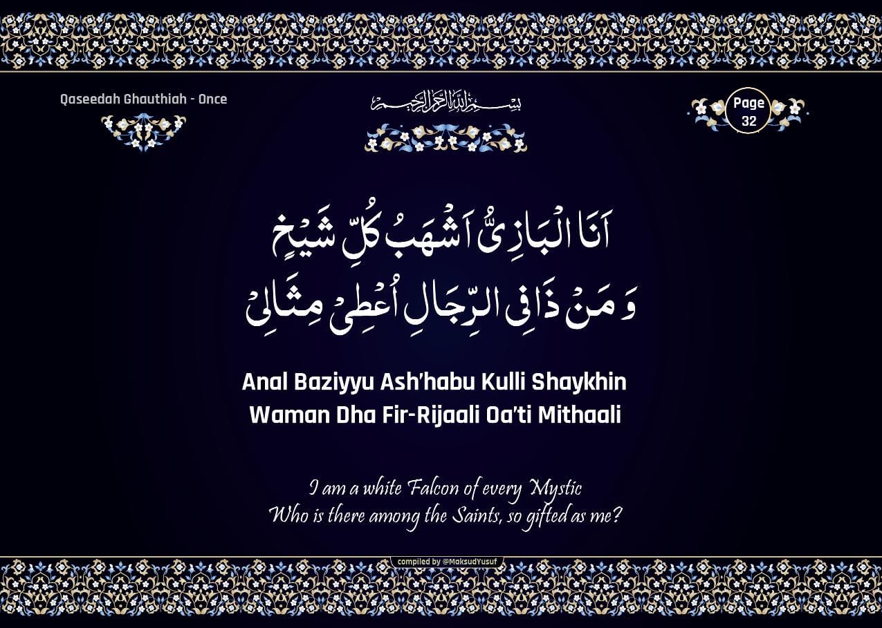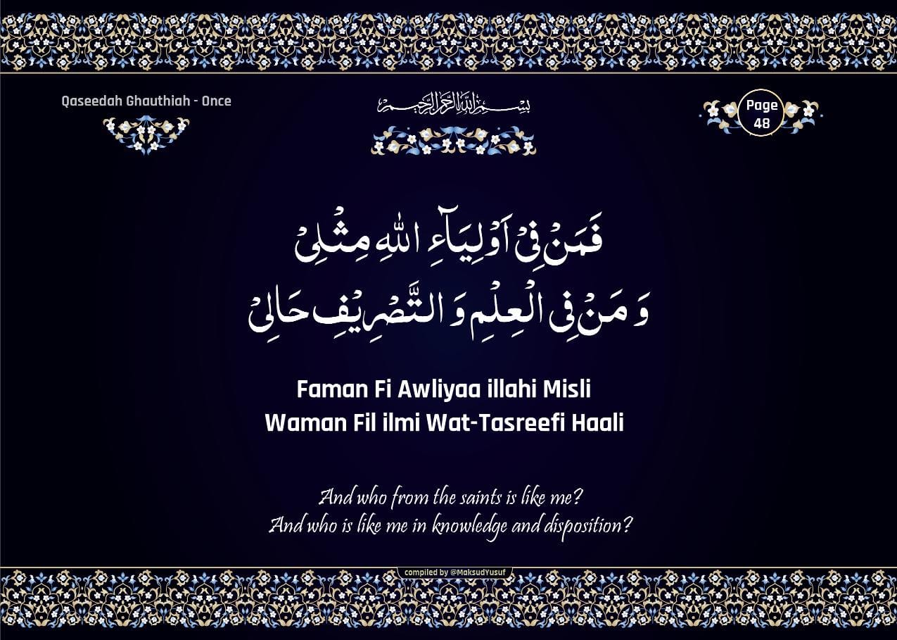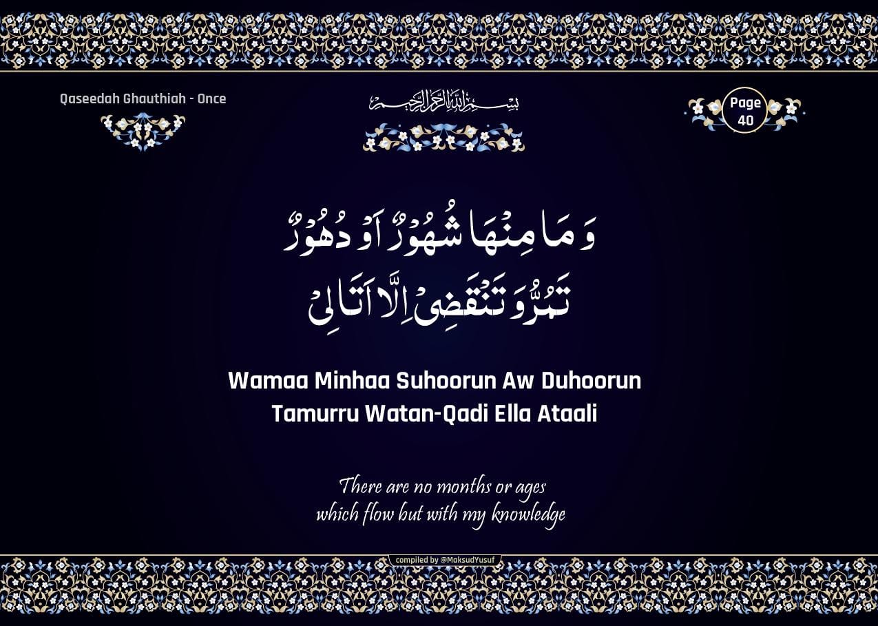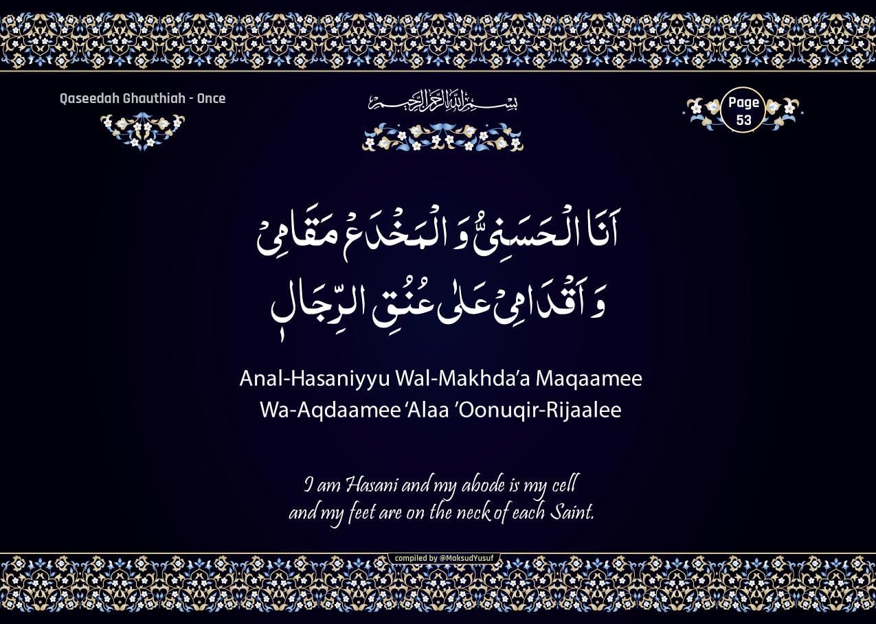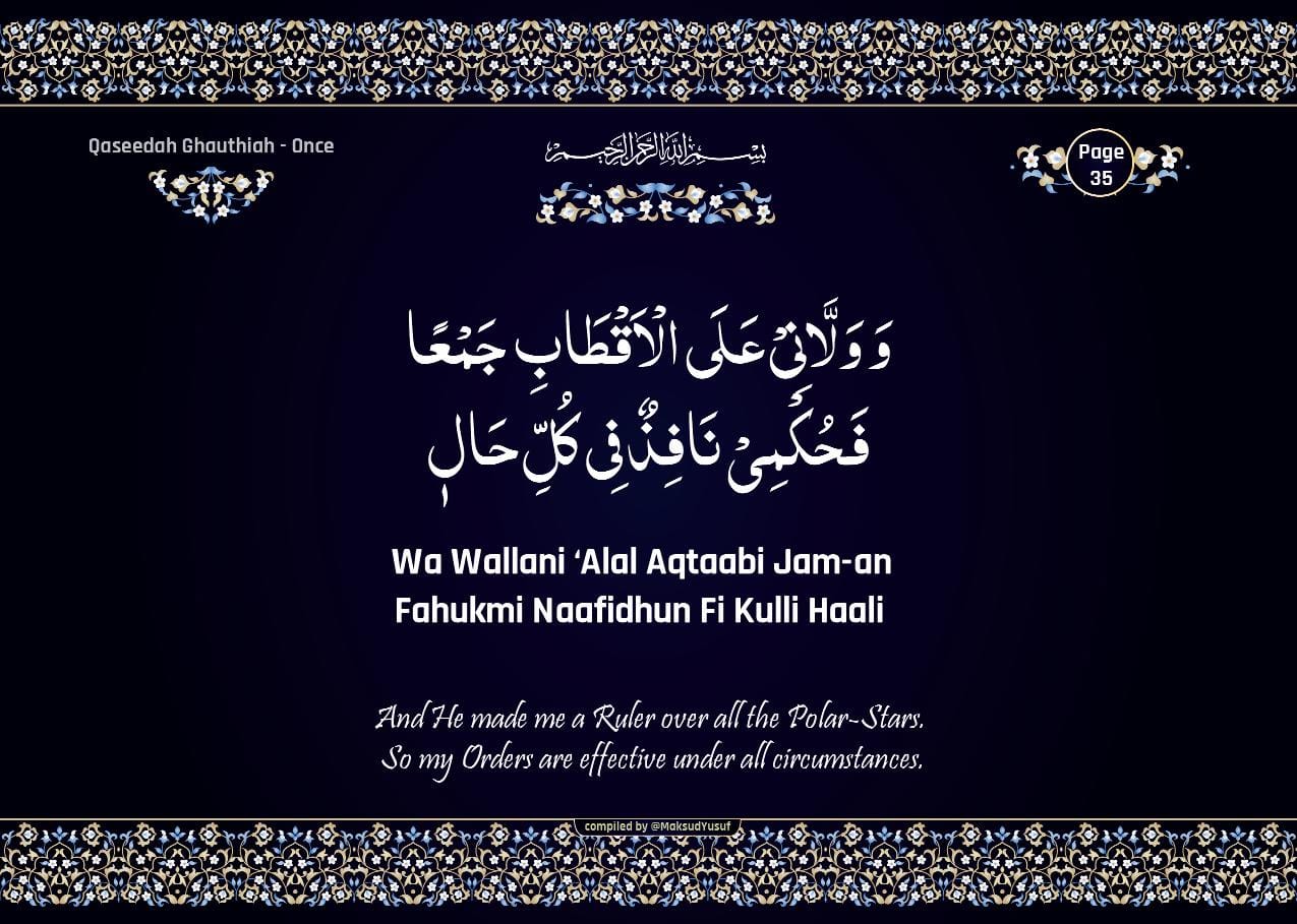 May I not encounter any difficulties in your presence. This is not difficult for you Oh Ghaus! Please help bless us with success in both worlds! O! Ghause Azam the one who helps with his own hands!”
