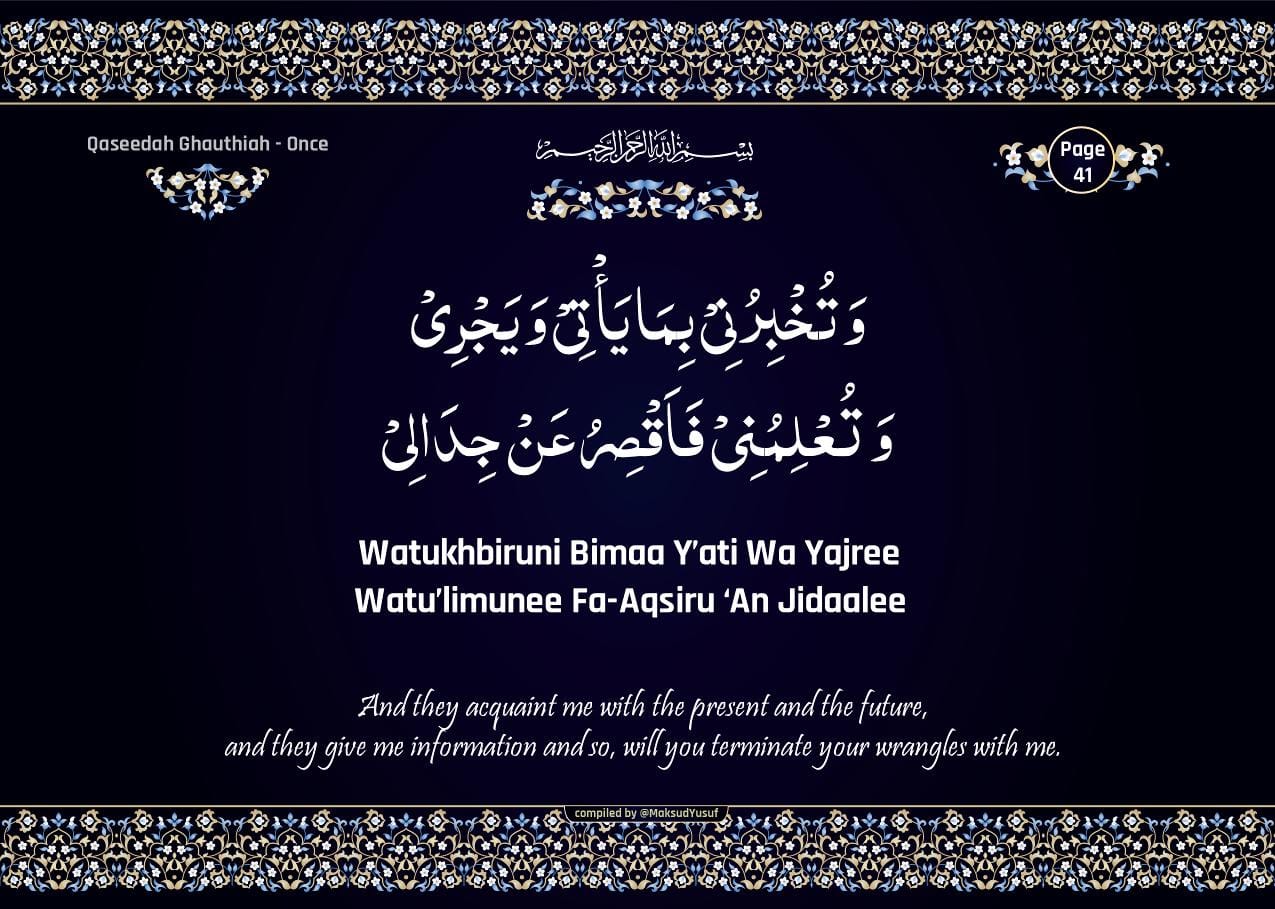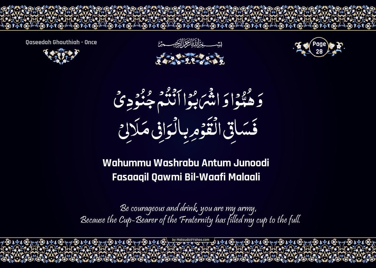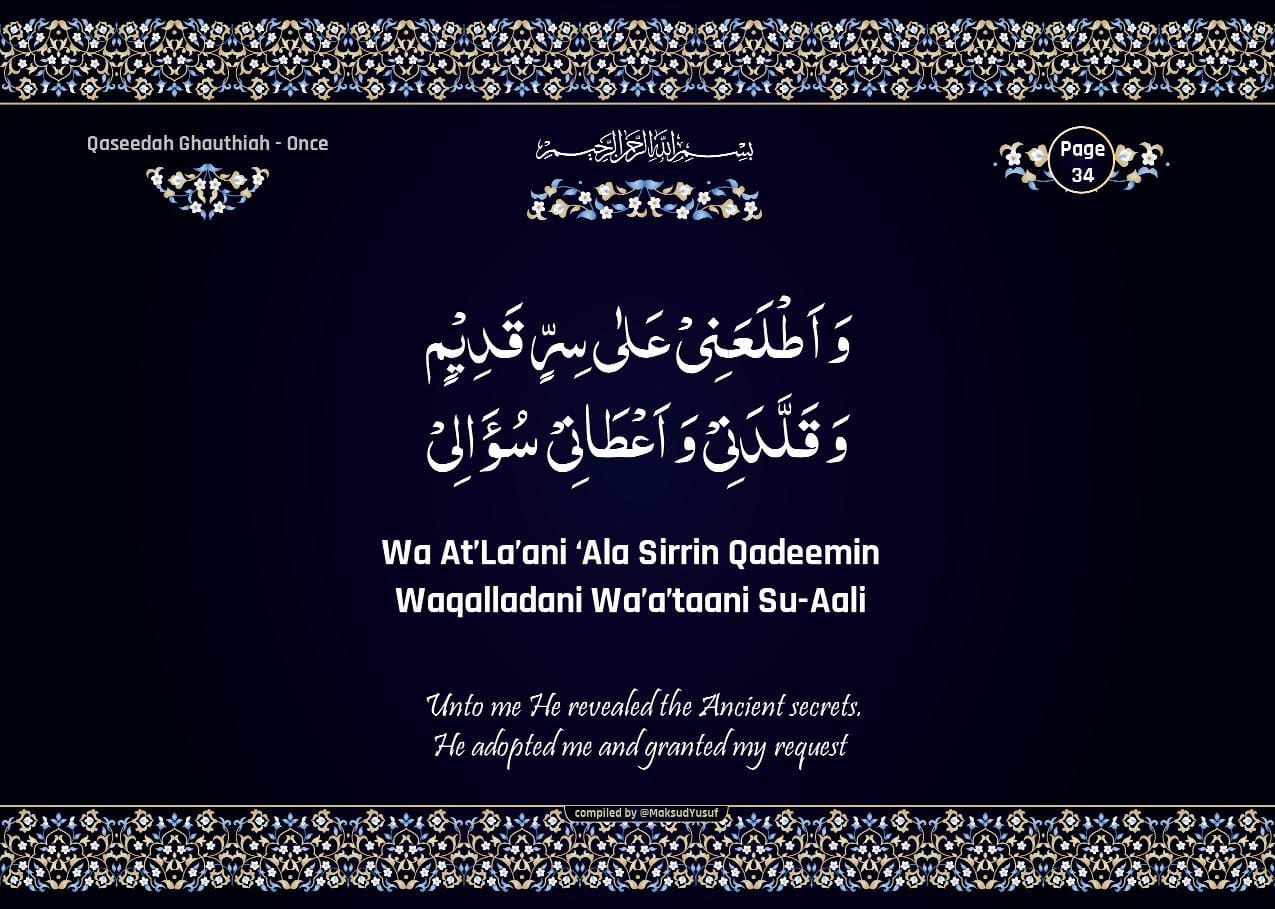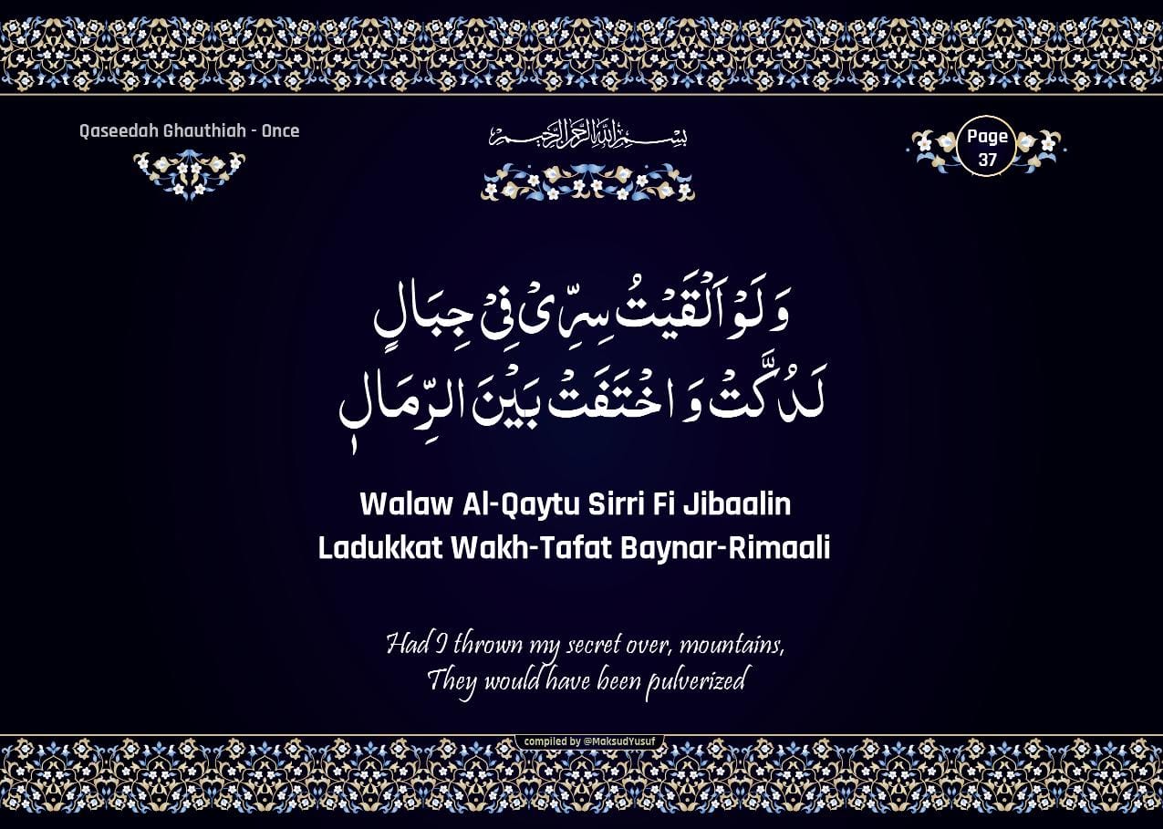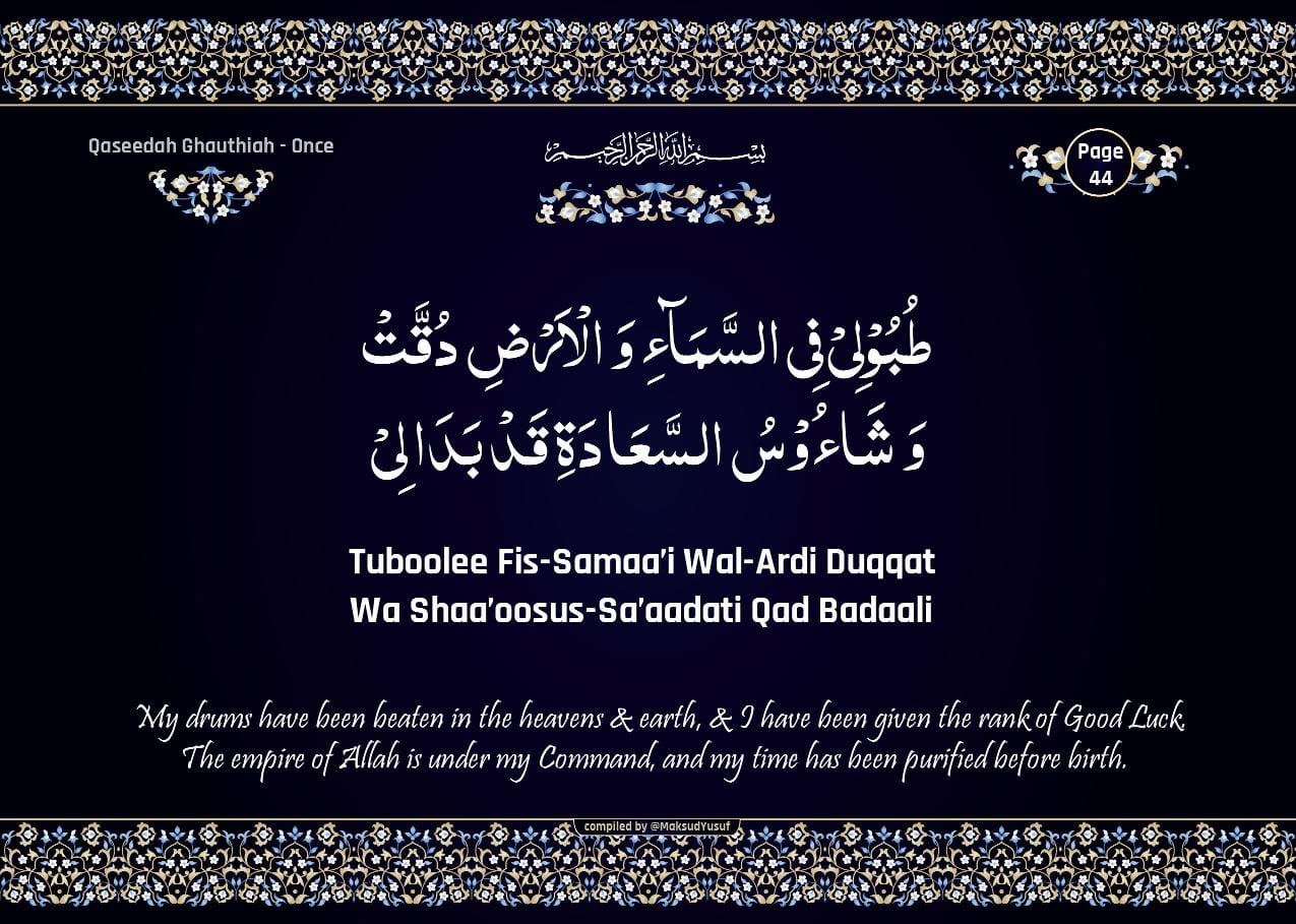 May I not encounter any difficulties in your presence. This is not difficult for you Oh Ghaus! Please help bless us with success in both worlds! O! Ghause Azam the one who helps with his own hands!”