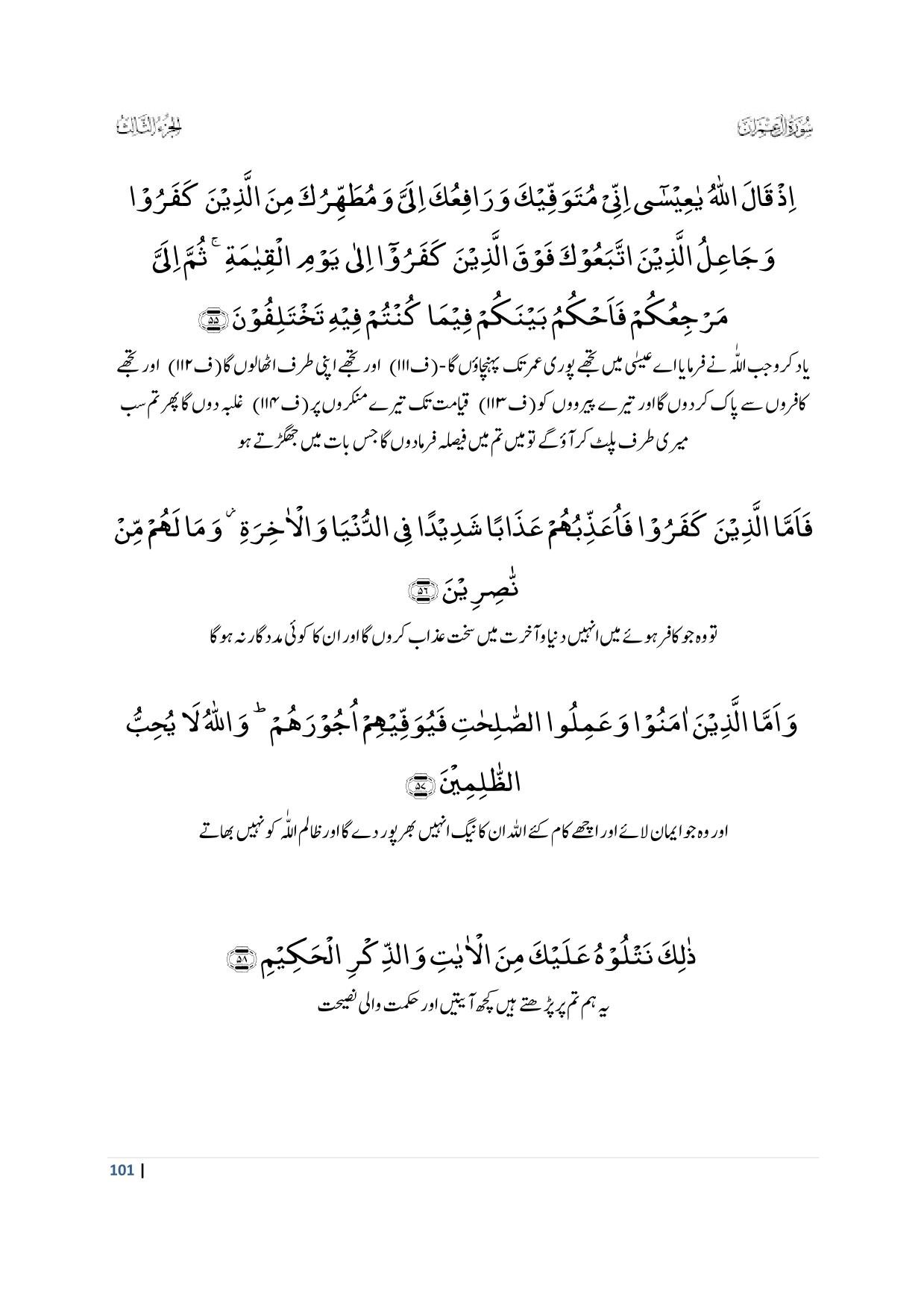 55. Iz Qaalal Laahu Yaa ‘Eesaaa Innee Mutawaffeeka Wa Raafi’uka Ilaiya Wa Mutah Hiruka Minal Lazeena Kafaroo Wa Jaa’ilul Lazeenattaba Ooka Fawqal Lazeena Kafarooo Ilaa Yawmil Qiyaamati Summa Ilaiya Marji’ukum Fa Ahkumu Bainakum Feemaa Kuntum Feehi Takhtaliifoon