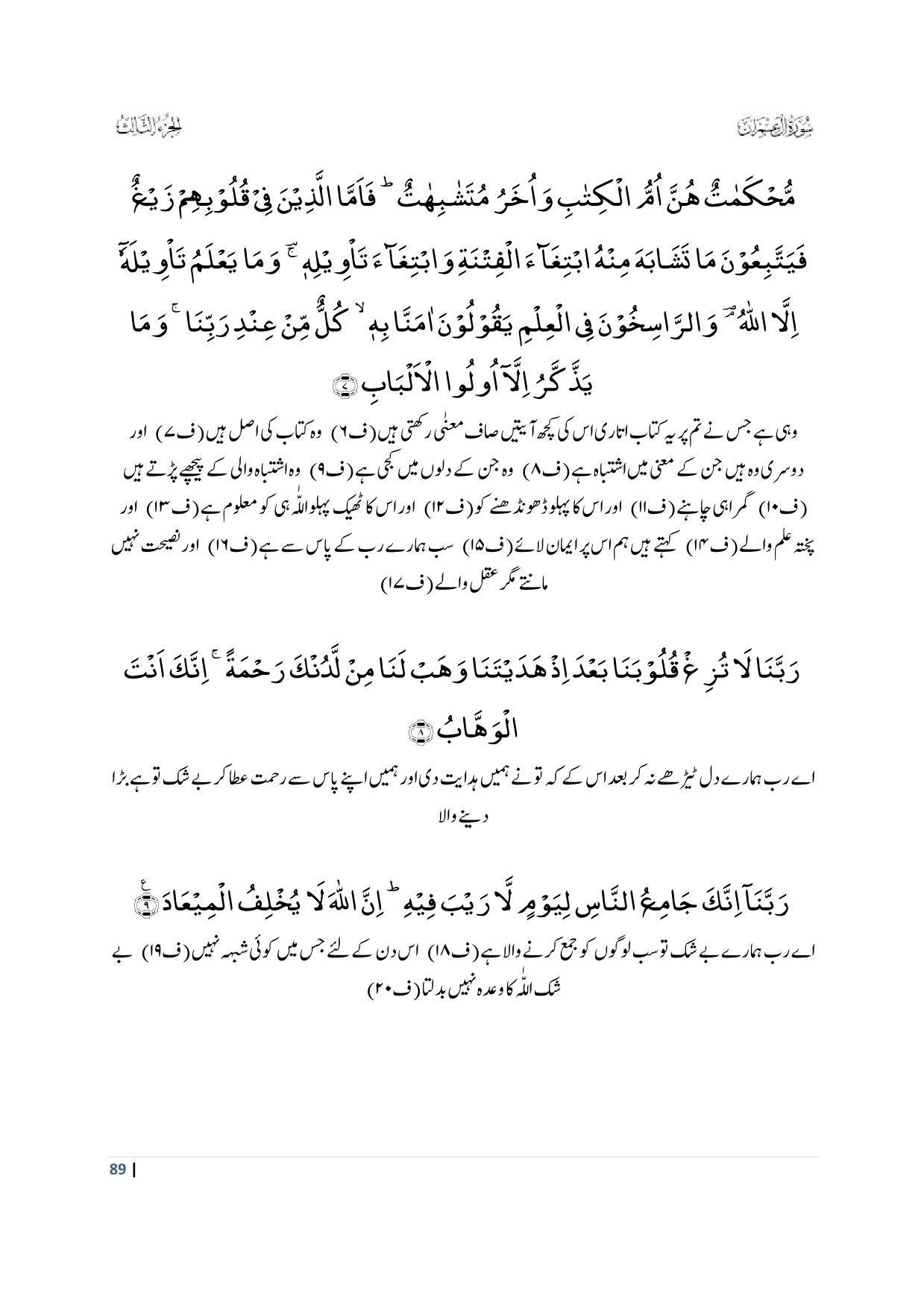 7. Huwal Lazeee Anzala ‘Alaikal Kitaaba Minhu Aayaatum Muh Kamaatun Hunna Ummul Kitaabi Wa Ukharu Mutashaabihaatun Fa’ammal Lazeena Fee Quloobihim Zaiyghun Fa Yattabi’oona Ma Tashaabaha Minhubtighaaa ‘Alfitnati Wabtighaaa’a Taaweelih; Wa Maa Ya’lamu Taaweelahooo Illal Laah; Warraasikhoona Fil ‘Ilmi Yaqooloona Aamannaa Bihee Kullum Min ‘Indi Rabbinaa; Wa Maa Yazzakkaru Illaaa Ulul Albaab