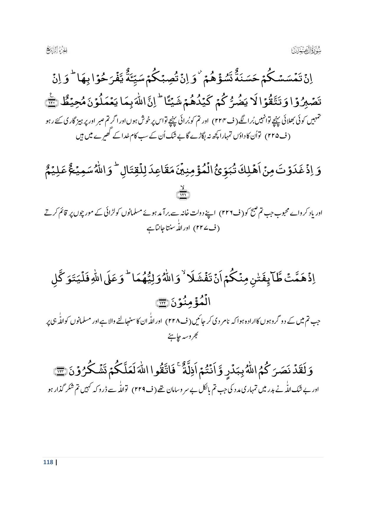 120. In Tamsaskum Hasanatun Tasu’hum Wa In Tusibkum Saiyi’atuny Yafrahoo Bihaa Wa In Tasbiroo Wa Tattaqoo Laa Yad Urrukum Kaiduhum Shai’aa; Innal Laaha Bimaa Ya’maloona Muheet (Section 12)
