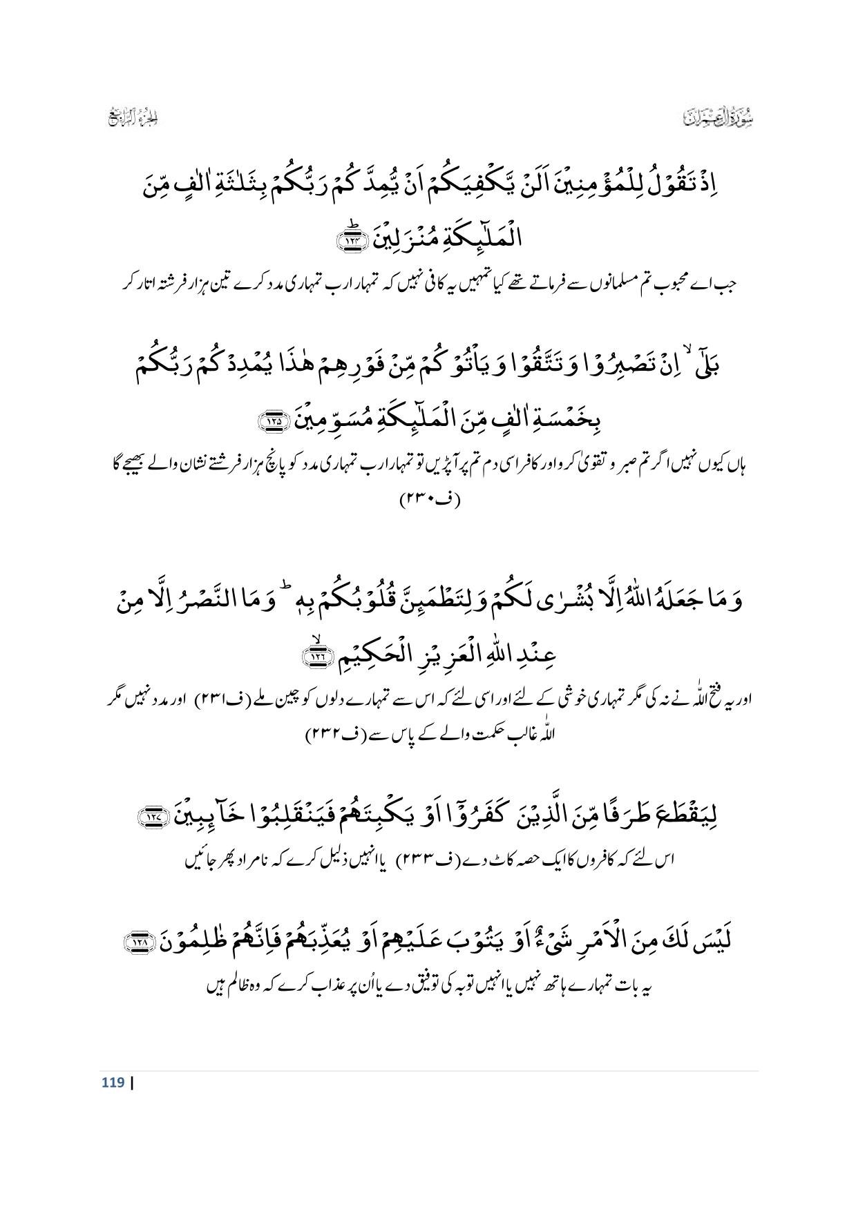 124. Iz Taqoolu Lilmu’mineena Alai Yakfiyakum Ai-Yumiddakum Rabbukum Bisalaasati Aalaafim Minal Malaaa’ikati Munzaleen
