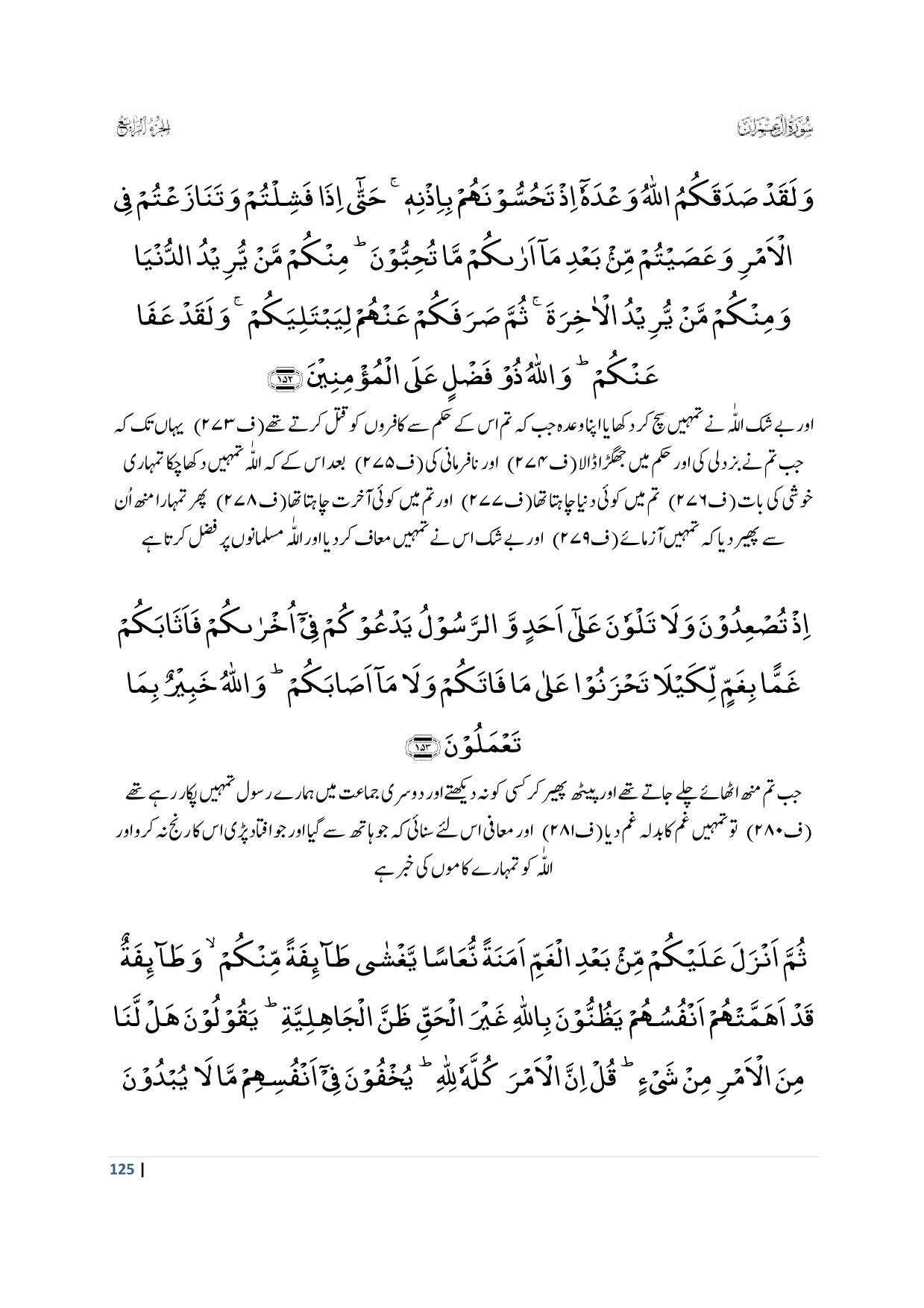 152. Wa Laqad Sadaqakumul Laahu Wa’dahooo Iz Tahussoo Nahum Bi Iznihee Hattaaa Izaa Fashiltum Wa Tanaaza’tum Fil Amri Wa ‘Asaitum Mim Ba’di Maaa Araakum Maa Tuhibboon; Minkum Mai Yureedud Dunyaa Wa Minkum Mai Yureedul Aakhirah; Summa Sarafakum ‘Anhum Liyabtaliyakum Wa Laqad ‘Afaa ‘Ankum; Wallaahu Zoo Fadlin ‘Alal Mu’mineen
