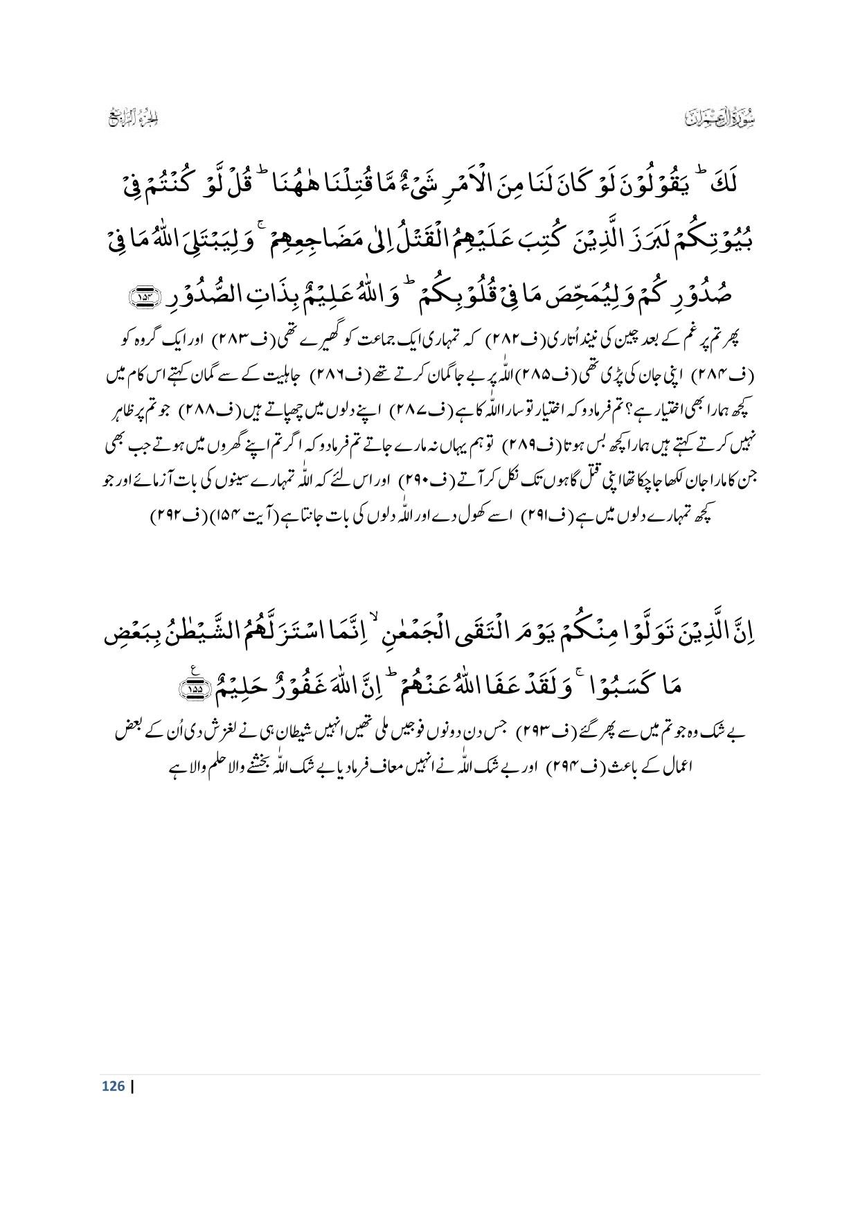 154. Summa Anzala ‘Alaikum Mim Ba’dil Ghammi Amanatan Nu’aasai Yaghshaa Taaa’ Ifatam Minkum Wa Taaa’ifatun Qad Ahammat-Hum Anfusuhum Yazunnoona Billaahi Ghairal Haqqi Zannal Jaahiliyyati Yaqooloona Hal Lanaa Minal Amri Min Shai’; Qul Innal Amra Kullahoo Lillaah; Yukhfoona Fee Anfusihim Maa Laa Yubdoona Laka Yaqooloona Law Kaana Lanaa Minal Amri Shai’ummaa Qutilnaa Haahunaa; Qul Law Kuntum Fee Buyootikum Labarazal Lazeena Kutiba ‘Alaihimul Qatlu Ilaa Madaaji’ihim Wa Liyabtaliyal Laahu Maa Fee Sudoorikum Wa Liyumah Hisa Maa Fee Quloobikum; Wallaahu ‘Aleemum Bizaatis Sudoor