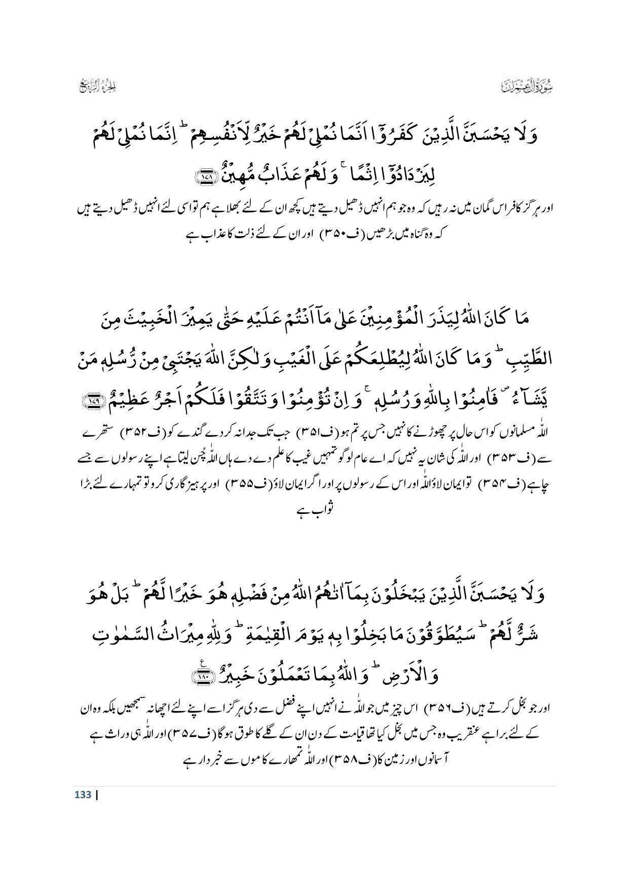 180. Wa Laa Yahsabannal Lazeena Yabkhaloona Bimaa Aataahumul Laahu Min Fadilhee Huwa Khairal Lahum Bal Huwa Sharrul Lahum Sayutaw Waqoona Maa Bakhiloo Bihee Yawmal Qiyaamah; Wa Lillaahi Meeraasus Samaawaati Wal Ard; Wallaahu Bimaa Ta’maloona Khabeer (Section 18)