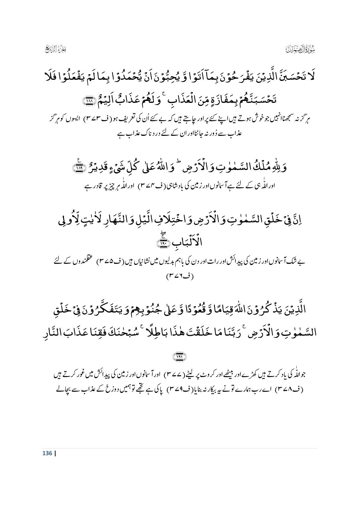 188. Laa Tahsabannal Lazeena Yafrahoona Bimaaa Ataw Wa Yuhibbona Ai Yuhmadoo Bimaa Lam Yaf’aloo Falaa Tahsabannahum Bimafaazatim Minal ‘Azaabi Wa Lahum ‘Azaabun Aleem