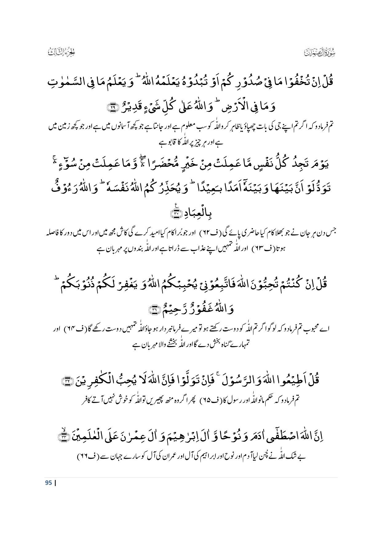 30. Yawma Tajidu Kullu Nafsim Maa’amilat Min Khairim Muhdaranw Wa Maa ‘Amilat Min Sooo’in Tawaddu Law Anna Bainahaa Wa Bainahooo Amadam Ba’eedaa; Wa Yuhazzirukumul Laahu Nafsah; Wallaahu Ra’oofum Bil’ibaad (Section 3)