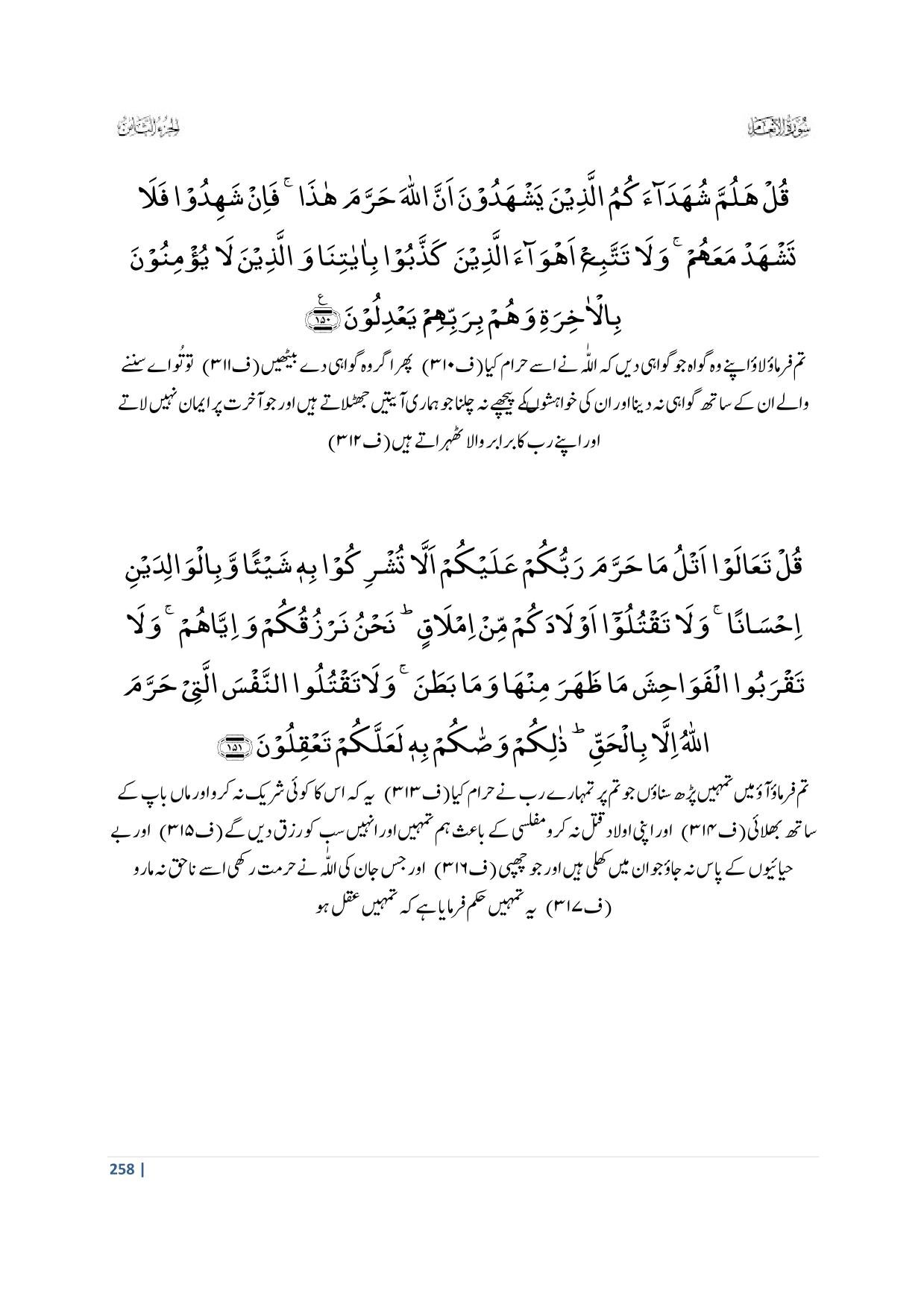 150. Qul Halumma Shuhadaaa’akumul Lazeena Yash Hadoona Annal Laaha Harrama Haazaa Fa In Shahidoo Falaa Tashhad Ma’ahum; Wa Laa Tattabi’ Ahwaaa’al Lazeena Kazzaboo Bi Aayaatinaa Wallazeena Laa Yu’minoona Bil Aakhirati Wa Hum Bi Rabbihim Ya’diloon (Section 18)