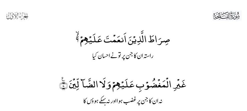 - صِرَاطَ الَّذِينَ أَنْعَمْتَ عَلَيْهِمْ غَيْرِ الْمَغْضُوبِ عَلَيْهِمْ وَلَا الضَّالِّينَ