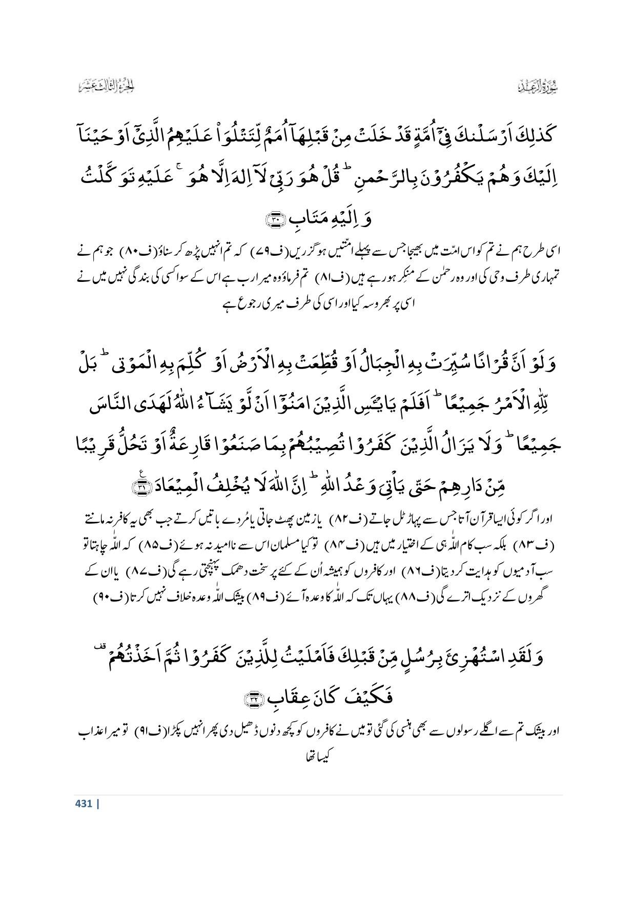 31. Wa Law Anna Quraanan Suyyirat Bihil Jibaalu Aw Qutti’at Bihil Ardu Aw Kullima Bihil Mawtaa; Bal Lillaahil Amru Jamee’aa; Afalam Yai’asil Lazeena Aamanooo Al Law Yashaaa ‘Ullaahu Lahadan Naasa Jamee’aa; Wa Laa Yazaalul Lazeena Kafaroo Tuseebuhum Bimaa Sana’oo Qaari’atun Aw Tahullu Qareebam Min Daarihim Hatta Ya’tiya Wa’dul Laah; Innal Laaha Laa Yukhliful Mee’aad (Section 4)