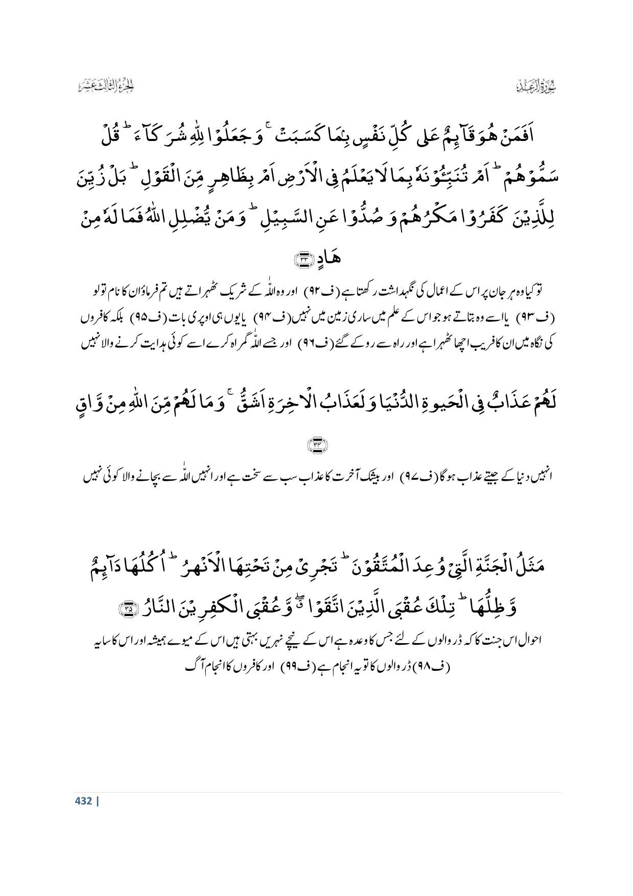 33. Afaman Huwa Qaaa’imun ‘Alaa Kulli Nafsim Bimaa Kasabat; Wa Ja’aloo Lillaahi Shurakaaa’a Qul Samoohum; Am Tunabbi’oona Hoo Bimaa Laa Ya’lamu Fil Ardi; Am Bizaahirim Minal Qawl; Bal Zuyyina Lillazeena Kafaroo Makruhum Wa Suddoo ‘Anis Sabeel; Wa Mai Yudlilil Laahu Famaa Lahoo Min Haad;