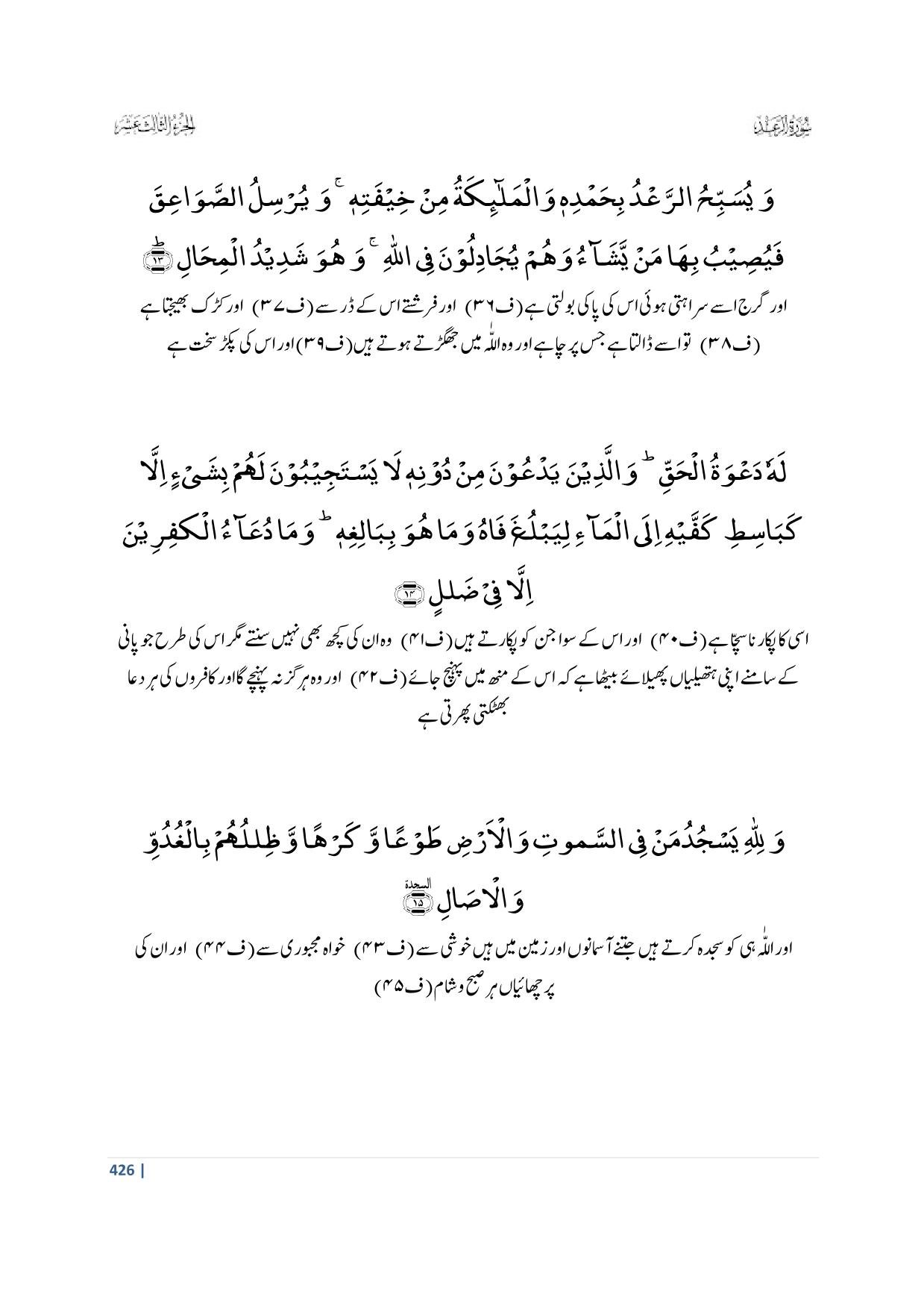 13. Wa Yusabbihur Ra’du Bihamdihee Walmalaaa’ikatu Min Kheefatihee Wa Yursilus Sawaa’iqa Fa Yuseebu Bihaa Mai Yashaaa’u Wa Hum Yujaadiloona Fil Laahi Wa Huwa Shadeedul Mihaal